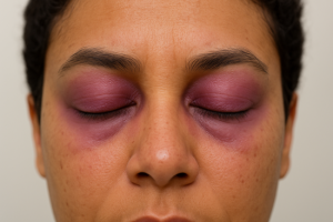 Caracteriza-se por uma erupção cutânea de coloração arroxeada ou avermelhada, com inchaço (edema), que ocorre especificamente nas pálpebras superiores e ao redor dos olhos.